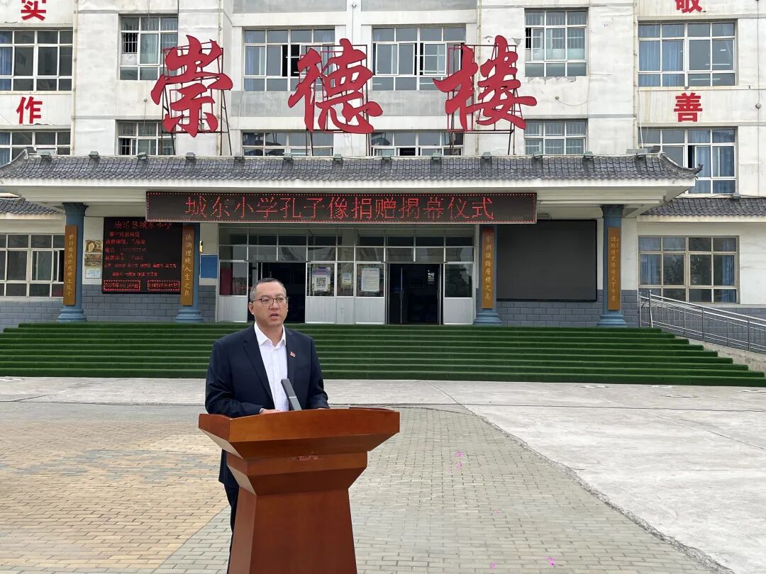 在致辞环节,义顺集团副总经理张世重深情回顾集团发展历程,自1925年创立以来,义顺集团秉持“仁中取利、义内求财”传家祖训,从康乐小商号成长为多元发展的集团公司,同时坚守社会责任,在捐资助学、扶贫济困领域累计投入超2000万元。捐建孔子像,也是响应弘扬中华优秀传统文化的号召。他表示,这尊来自山东曲阜的雕像,将成为校园文化地标,让圣贤精神浸润师生心灵。